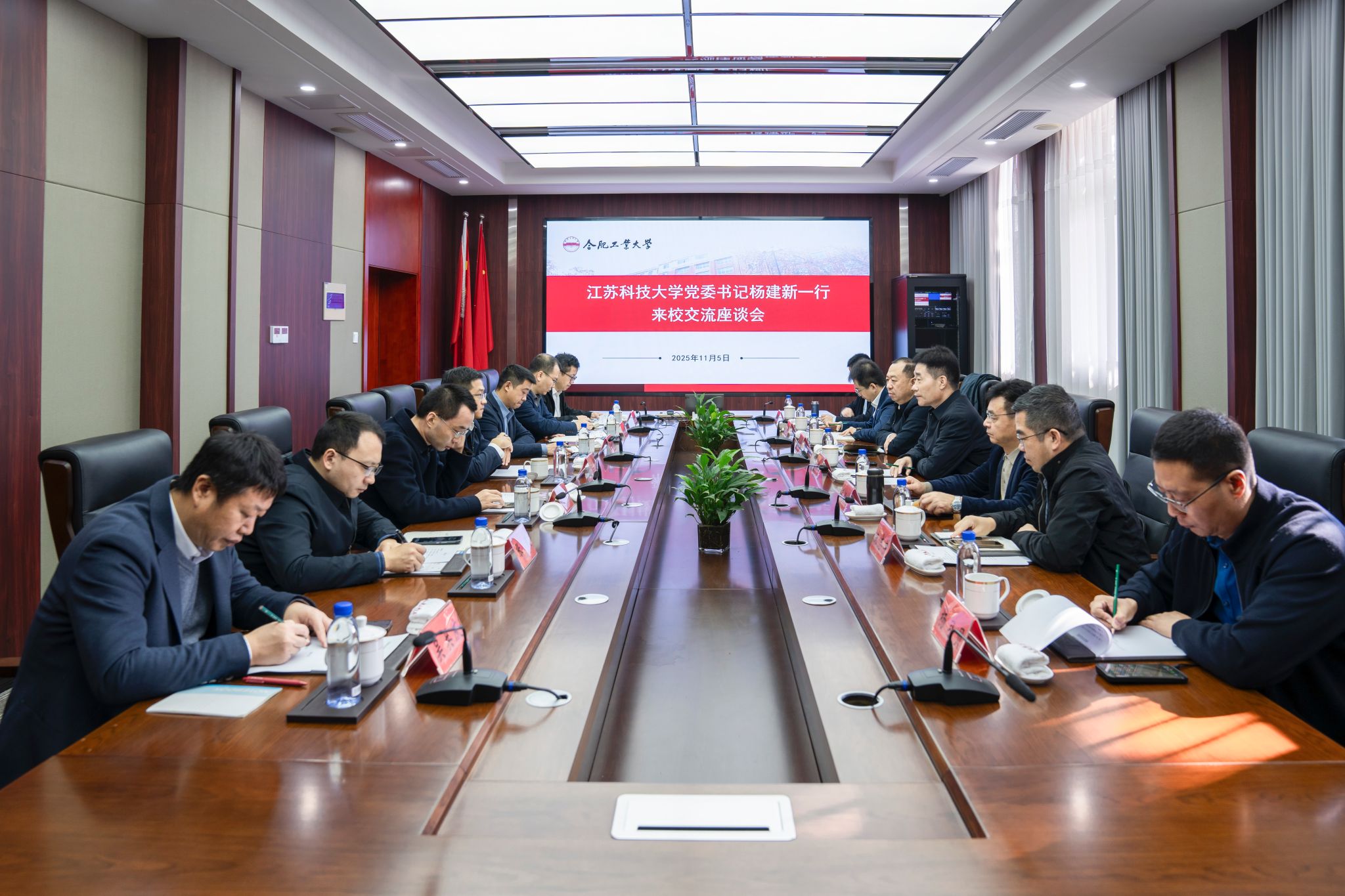 11月5日上午,江苏科技大学党委书记杨建新一行来校调研交流,校长汪萌出席座谈会。