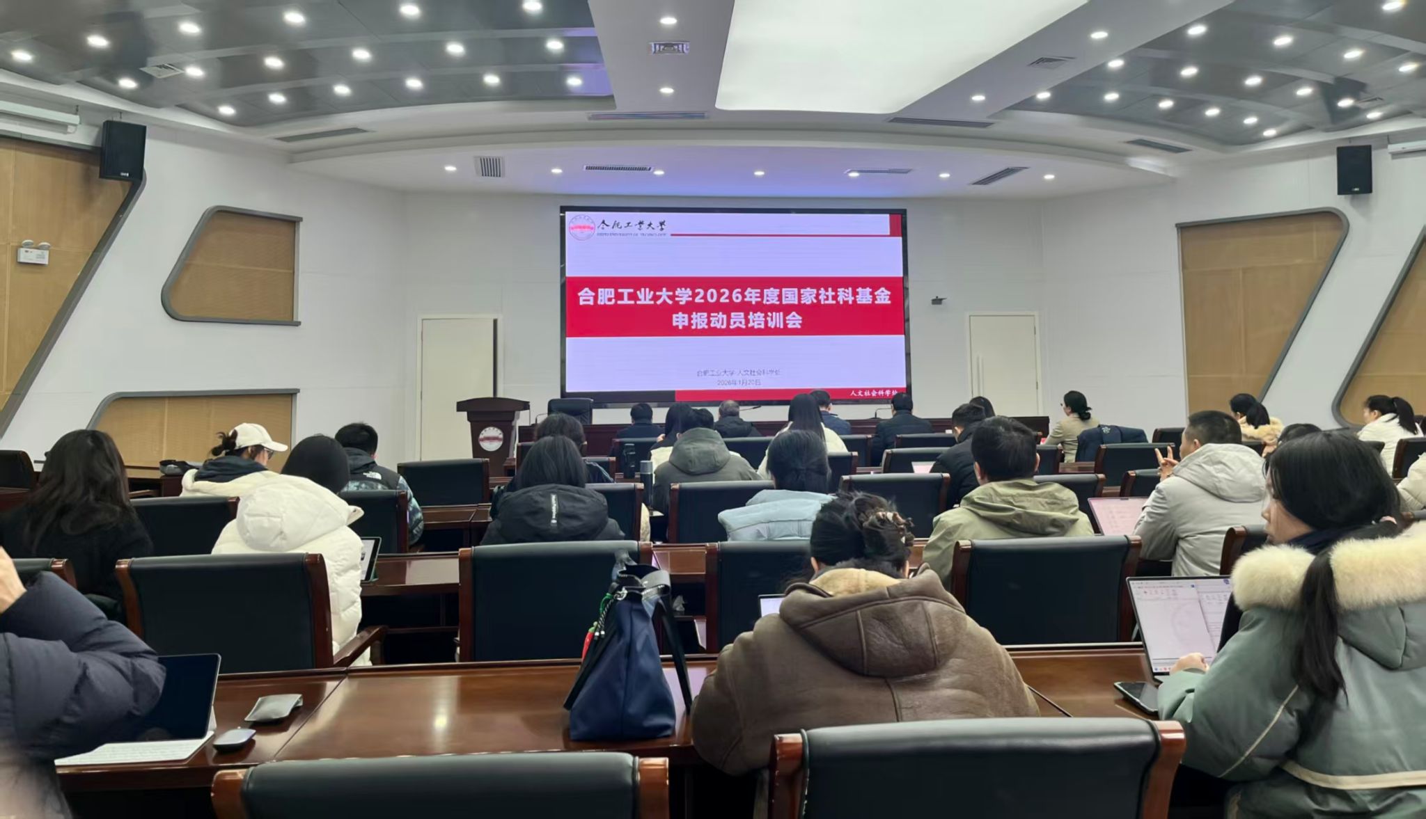1月20日下午,学校在学术会议中心召开2026年度国家社科基金项目申报动员培训会。校党委副书记胡笑旋出席会议。中共安徽省委宣传部理论处一级调研员唐国富致辞,四级调研员强惠玲讲解基金申报政策。浙江大学黄鹂强教授、安徽大学李静教授作基金申报辅导报告。