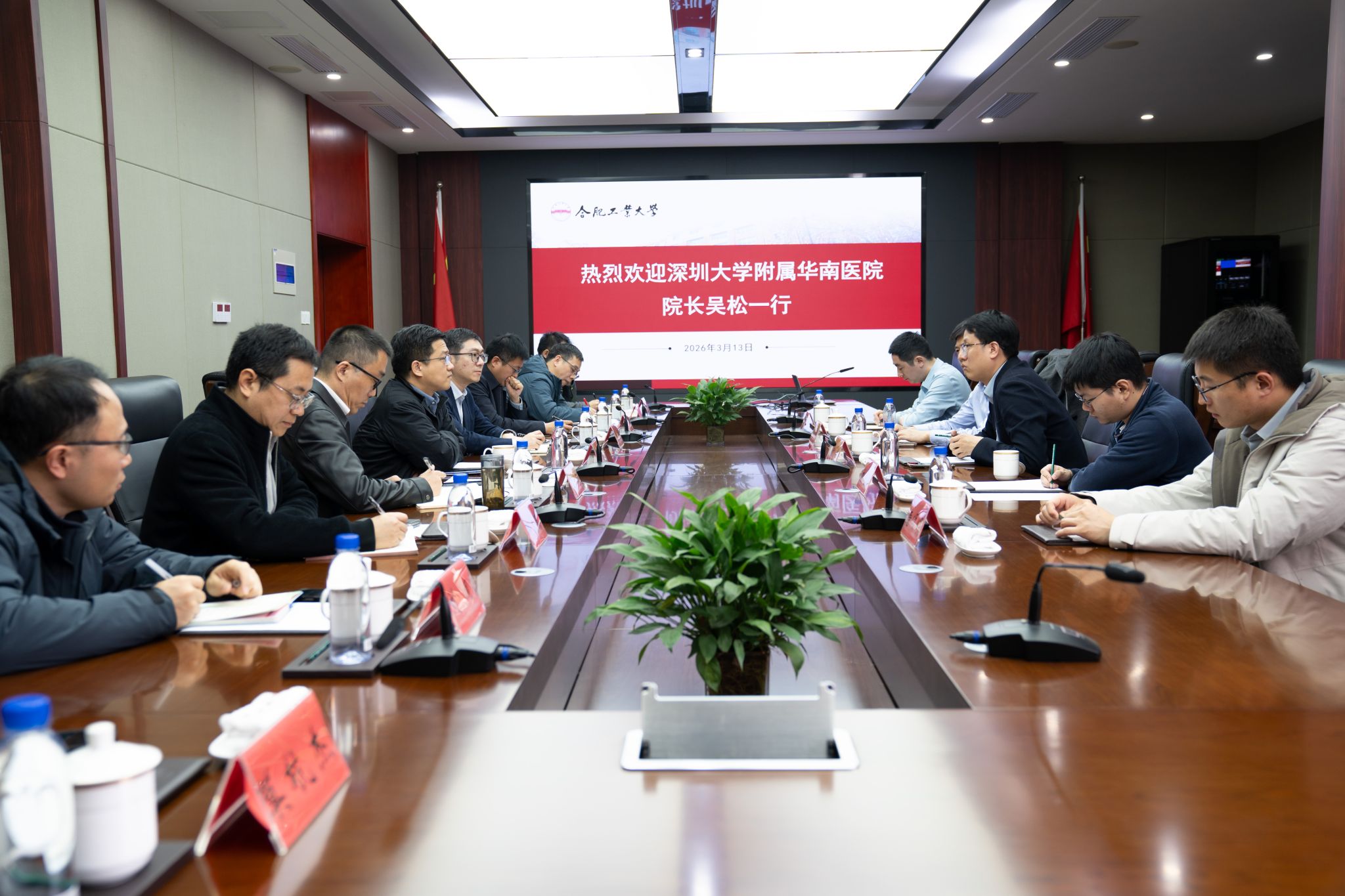 3月13日,深圳大学附属华南医院院长吴松一行来校调研,双方围绕新兴交叉学科、科技成果转化等领域进行座谈交流。校长汪萌出席座谈会。