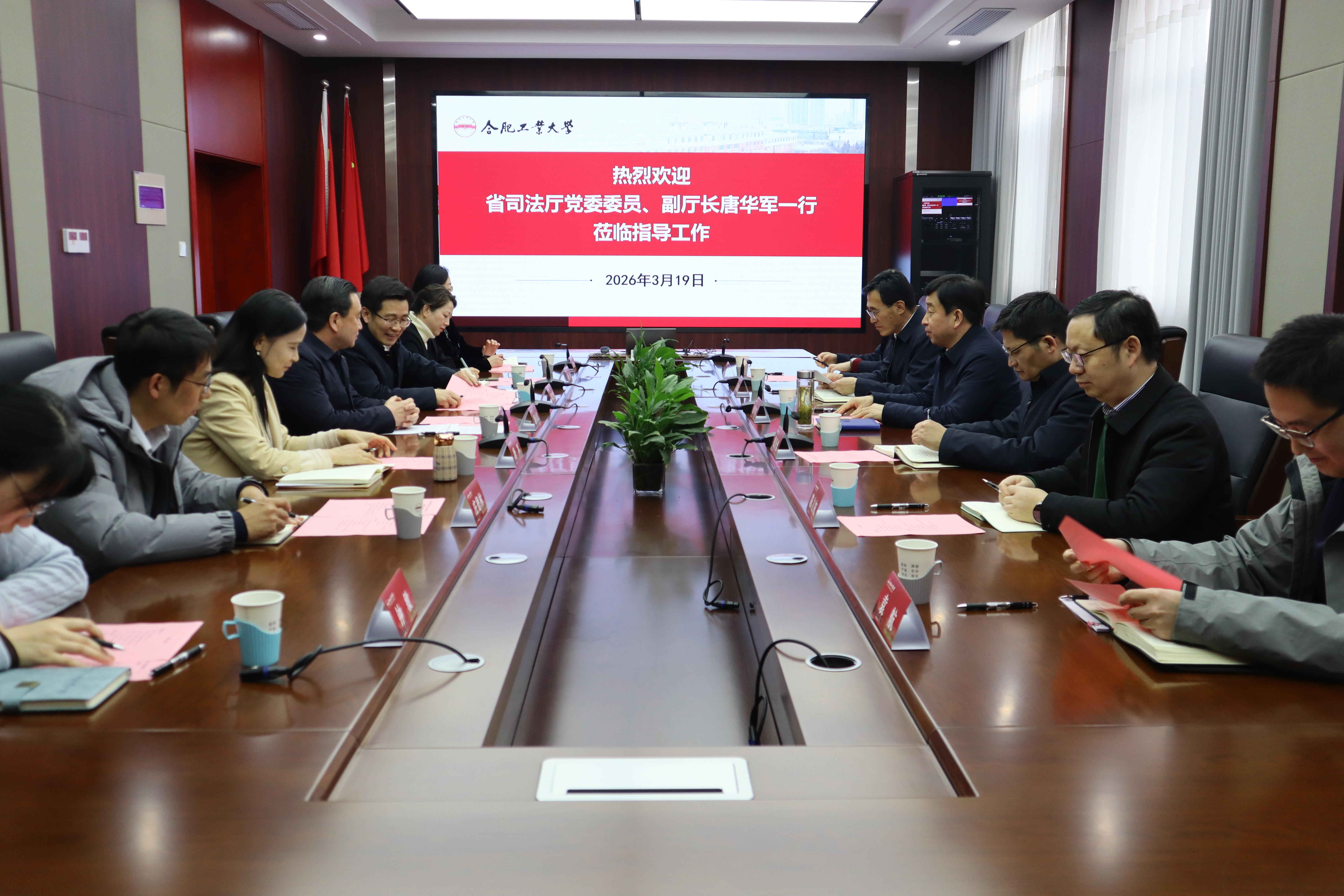 唐华军对学校近年来取得的显著办学成果及涉外法治人才培养成效给予高度评价。他表示,当前安徽正处于高质量发展关键期,新能源汽车、低空经济等新兴产业加速出海,涉外法治人才短缺、企业海外法律风险防控薄弱等问题亟待破解,省司法厅将全力搭建校地合作桥梁。希望依托合肥工业大学的学科优势、人才优势与科研优势,深化厅校协同联动,补齐涉外法治建设短板,为安徽高质量发展筑牢法治根基。