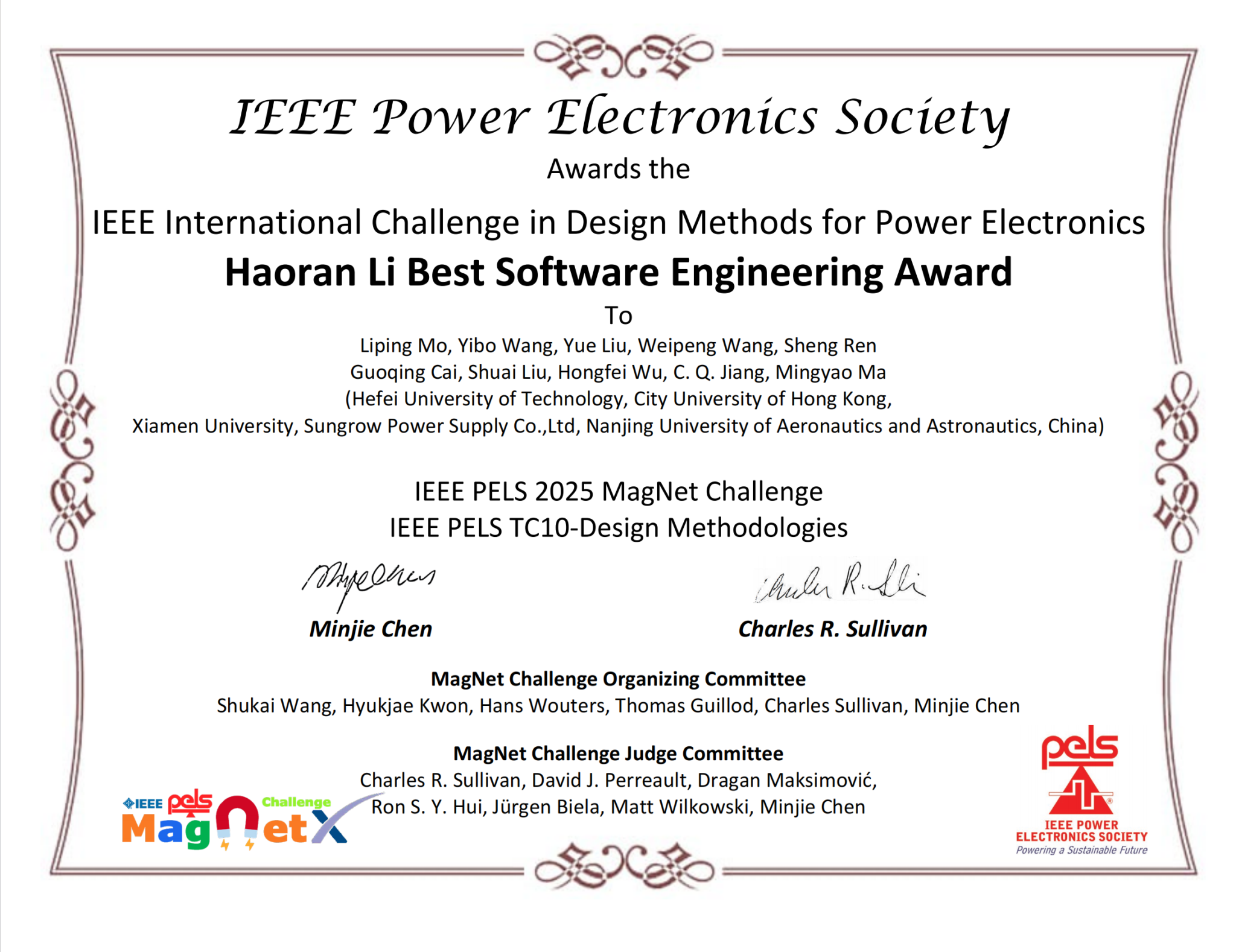 近日,全球电力电子磁建模领域顶级赛事IEEE MagNet Challenge 2 圆满收官。由我校电气与自动化工程学院恒爱精诚团队莫李平牵头,联合香港城市大学、厦门大学等高校组建的跨校联合战队HFUT-CITYUHK-XMU,在产业指导香港城市大学江朝强教授的悉心引领和阳光电源股份有限公司的全力支持下脱颖而出,一举斩获杰出性能奖全球第二名、最佳软件工程奖全球第一名(全球唯一)的佳绩,揽获赛事奖金10000美元,成为本次大赛亚洲地区唯一获奖队伍,也是本届大赛中唯一一支同时斩获两项大奖的参赛队伍,充分彰显了我校在电力电子磁建模领域的国际领先水平。
