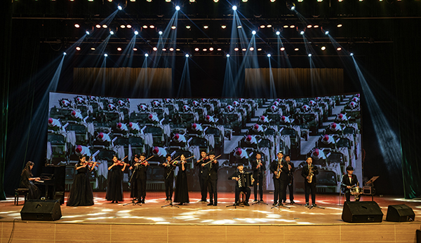 在砥砺奋进书华章篇章中,管弦乐合奏《钢铁洪流进行曲》为台下观众们带来一场听觉盛宴,铿锵有力的节奏带领台下观众再次重温新中国成立70周年国庆阅兵仪式气势磅礴的现场。校区工会女工委的老师们带来舞蹈《绒花》以优美曼妙的舞姿表现出铮铮硬骨绽花开的美好景象。
