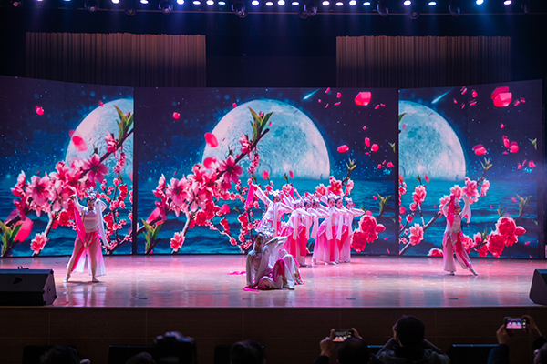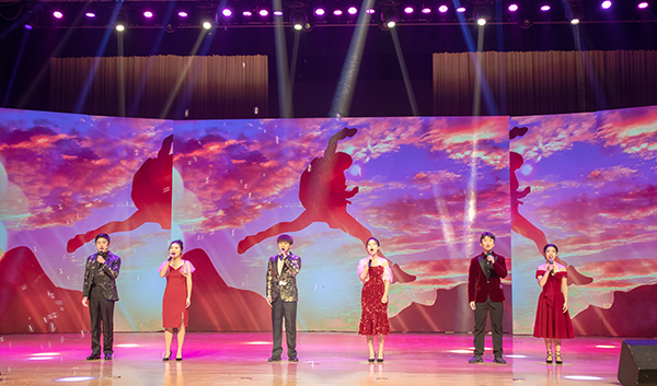 在四海相聚心连心篇章中,歌曲《我们都是追梦人》6名演员用嘹亮的歌声表达了工大学子坚定中华民族伟大复兴中国梦的信念和砥砺奋进建功新时代的决心。朗诵节目《逐梦中国》的同学们用饱含深情的语言讲述了新中国的发展历程,展望百年未来。舞蹈《桃夭》以华丽的舞美效果与优美曼妙的舞姿,使观众们感受到“太平歌盛世,垄上踏歌行”的繁荣景象。