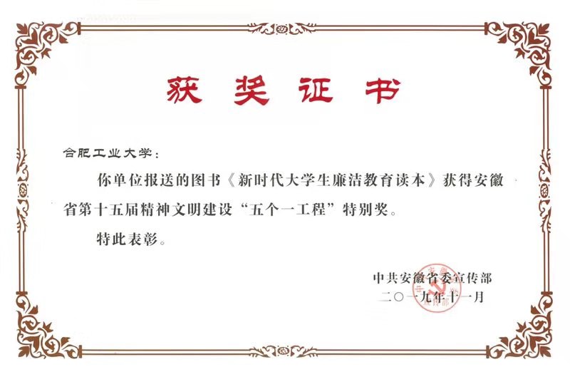我校出版社策划出版的《新时代大学生廉洁教育读本》获得本届精神文明建设“五个一工程”奖特别奖。该书以习近平新时代中国特色社会主义思想为指引,紧扣党中央对全面从严治党和反腐败工作的系列部署,清晰回答了什么是腐败、腐败的特征以及危害等大家关心的热点问题,全景式地展示了党的十八大以来开展的波澜壮阔反腐败斗争画卷,全面阐述了如何认识腐败、惩治腐败、预防腐败,以及如何让新时代大学生筑牢思想防线,自觉远离腐败等内容。该书2019年8月还入选 “安徽廉洁文化精品工程”。