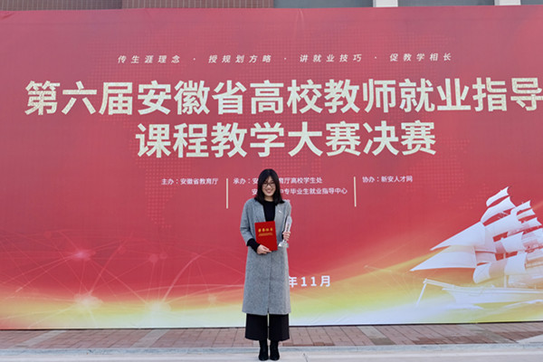11月23日,由安徽省教育厅主办,省教育厅高校学生处、省大中专毕业生就业指导中心承办,新安人才网协办的第六届安徽省高校教师就业指导课程教学大赛决赛在安徽新华学院落下帷幕,我校推选的食品与生物工程学院刘雯雯老师以优异成绩获大赛金奖。