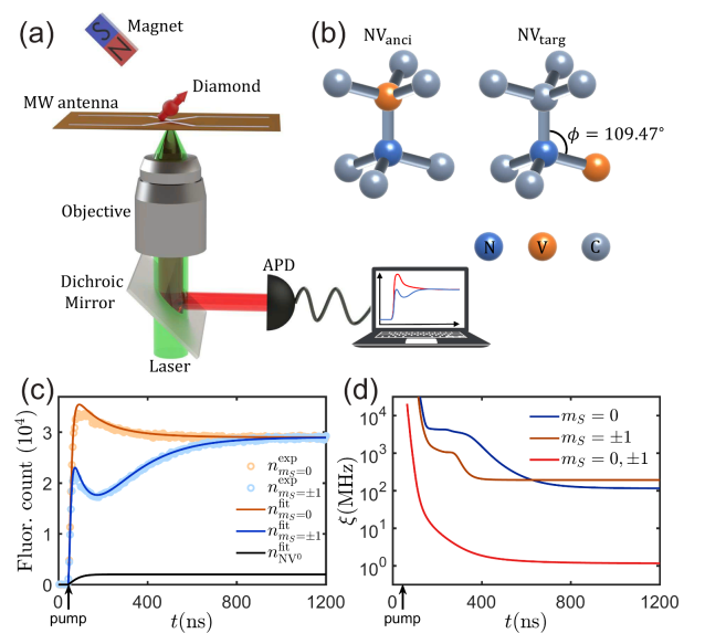 图1.(a) 基于耗散动力学的时间分辨荧光测量原理示意;(b) 通过速率方程模型重建磁场方向与强度;(c) 、(d)实验荧光曲线与理论拟合结果的对比。