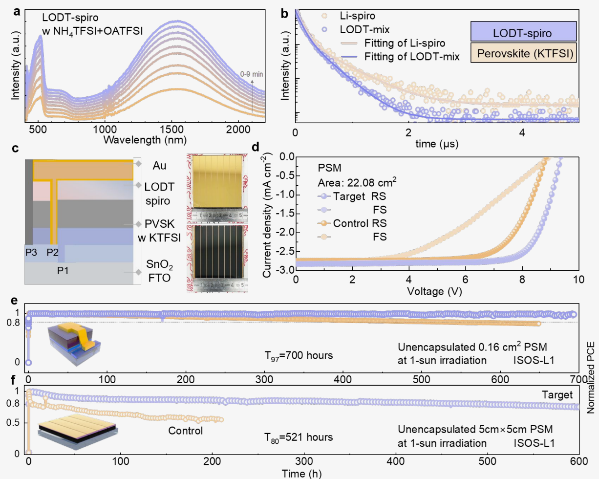 图4基于LODT策略的钙钛矿光伏组件(PSM)性能与稳定性方面的实验结果