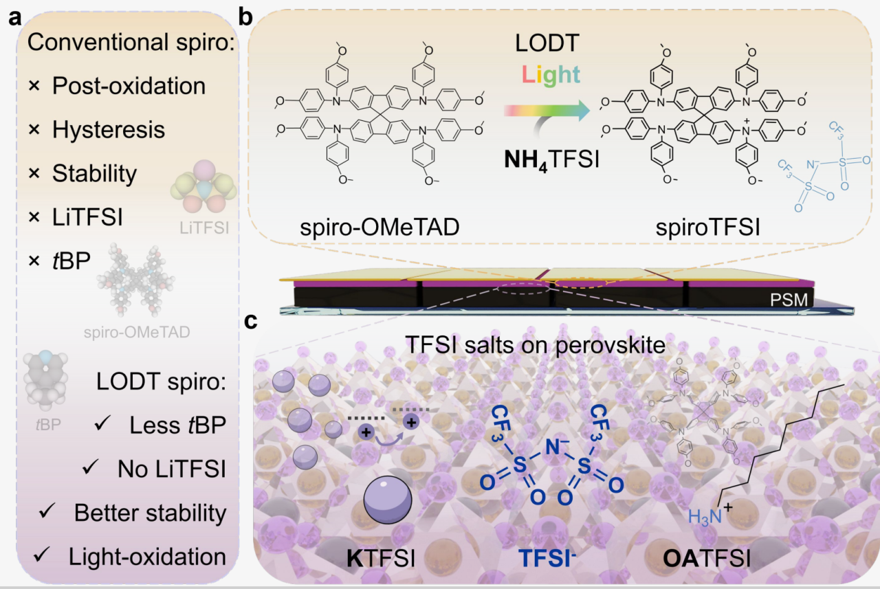 图3光加速氧化掺杂(LODT)策略及TFSI盐协同调控钙钛矿光伏器件的机制示意图