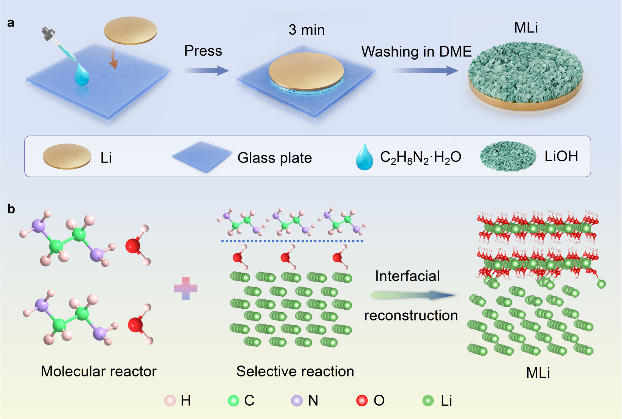 当用于锂硫电池时,C2H8N2·H2O 改性的锂(MLi)有效缓解了可溶性多硫化锂的侵蚀,锂金属负极和电池性能均显著提高。通过优化电解液的成分、界面反应时间、分子反应器的种类以及反应工艺技术,电池的性能可得到进一步提升。其它含结合水的分子可能具有相同的功能。此外,本研究提出的策略还可推广至其它金属负极(钠、钾、镁、锌等)。这些方面目前课题组正在进行系统研究,为锂金属负极及其它金属负极的改进提供了新的启示。
