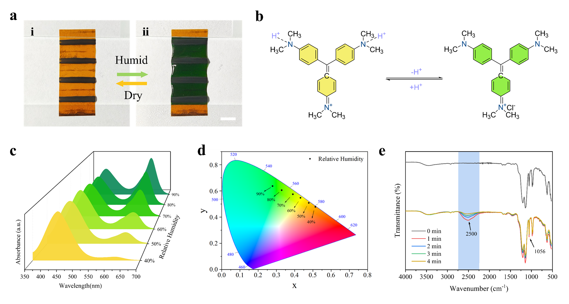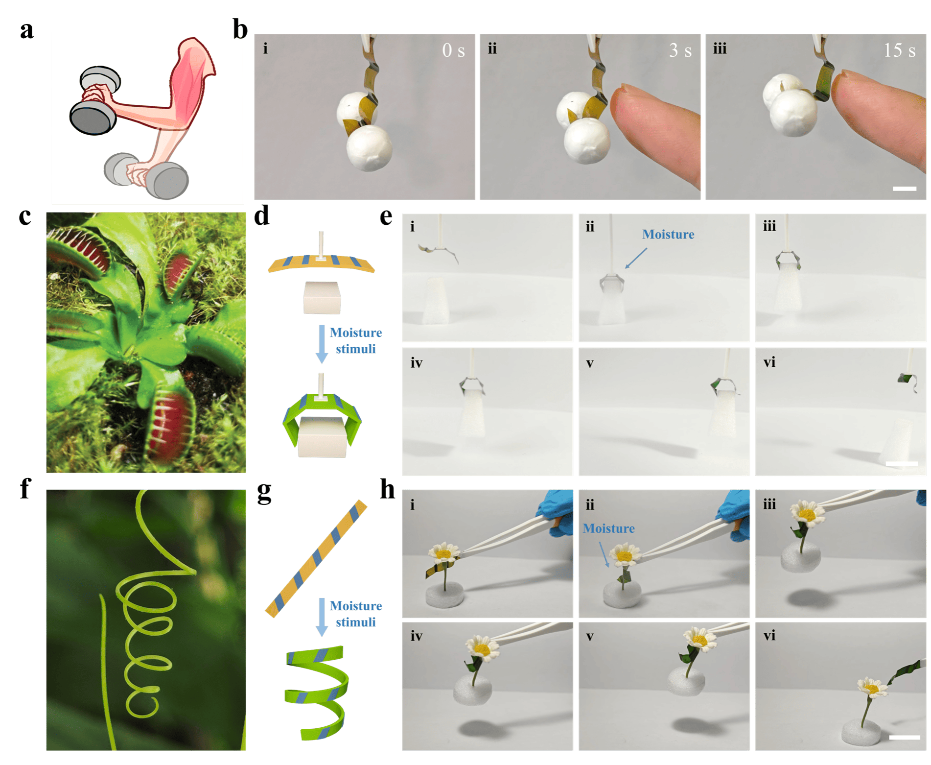 自然界中,植物叶片在环境湿度变化下会表现出卷曲、皱缩等自适应运动,同时伴随颜色改变,这为智能软体驱动器的设计提供了宝贵灵感。然而,如何在驱动器上同时实现高驱动性能、可编程变形和颜色变化反馈功能,仍是当前研究的难点。