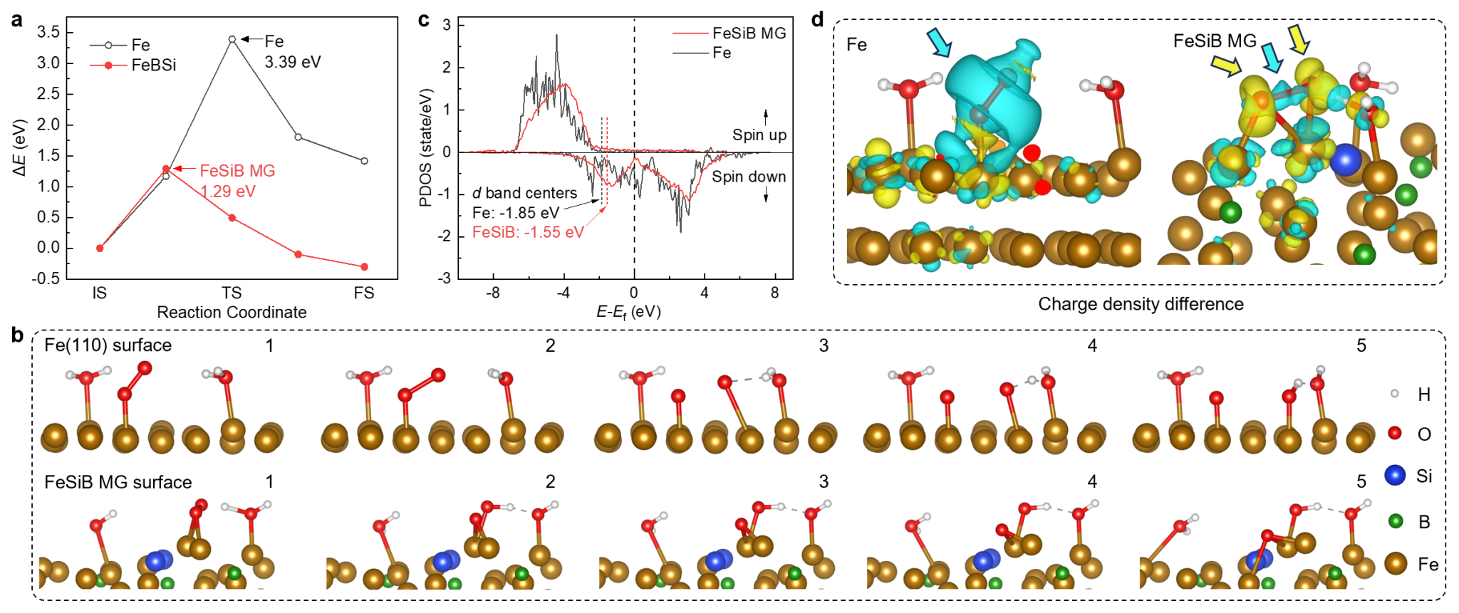 分子动力学模拟表明,非晶结构可显著降低氧气吸附能垒并促进氧分子解离。FeSiB 非晶合金的氧吸附能垒仅为1.29 eV,远低于晶态纯铁的3.39 eV。反应过程中,Fe与Si实现高效协同氧化,显著提升材料除氧性能;同时,反应生成的γ‑FeO(OH) 基纳米多孔产物与硅藻土形成 “强吸附区‑保水区” 耦合微结构,构建出持续的自催化循环,使反应速率随时间呈指数级提升,从根本上解决了传统除氧材料在反应后期动力学性能急剧衰减的难题。
